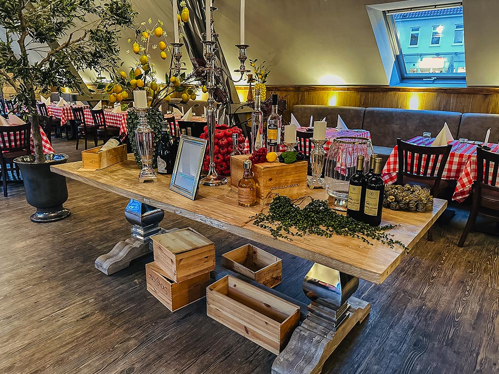 Soooo schön hier – das finden bestimmt auch deine Gäste. Typisch italienisch geben wir alles für (d)ein gelungenes Fest. Ob im kleinen Kreis, in großer Gesellschaft, oben, unten, drinnen, draußen, mit Menü, Buffet oder Tanzfläche: Wir sind gespannt auf deine Wünsche.